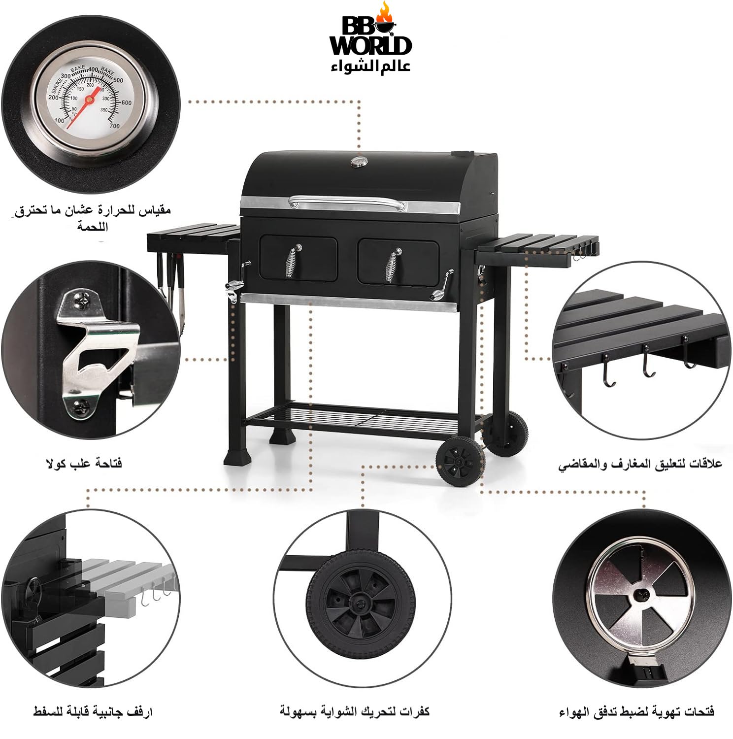 - باب أمامي يُمكنك من زيادة الفحم أو تقليله، أثناء الشواء دون الحاجة لرفع الشبك