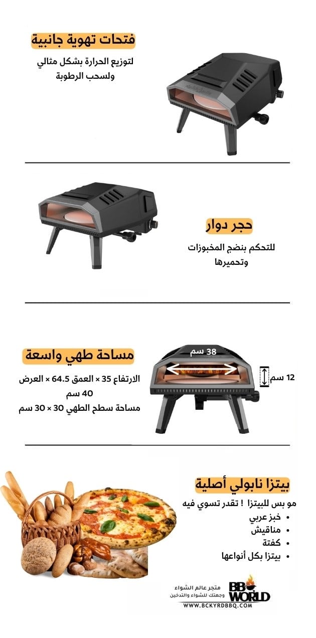 • قاعدة حجرية دوارة لتدوير البيتزا اثناء الطبخ باستخدام العجلة الجانبية مما يجعل البيتزا تستوي من جميع الجهات.