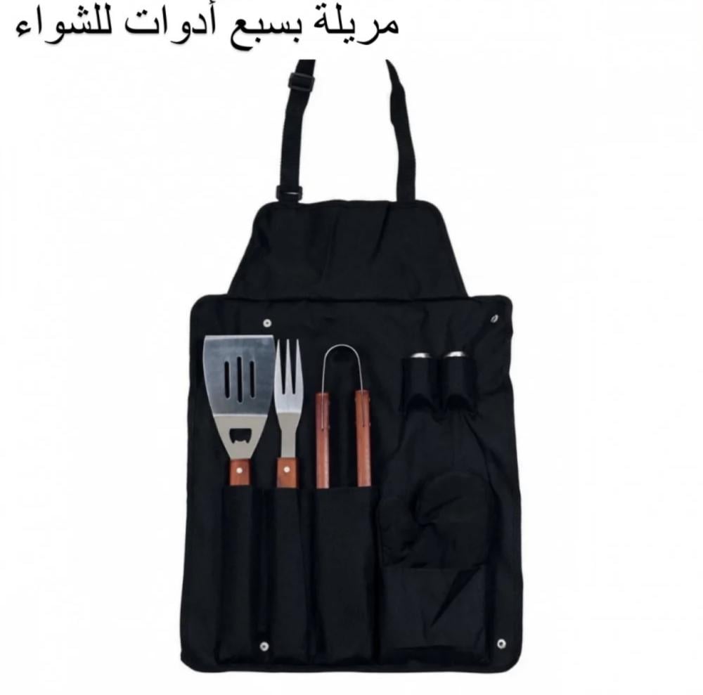 - تحتوي على عدة قطع: مريلة - ملقاط - ملّاس مخرم - شوكة كبيرة - قفاز شواء - طقم تبهير: ملّاحة وفلفل